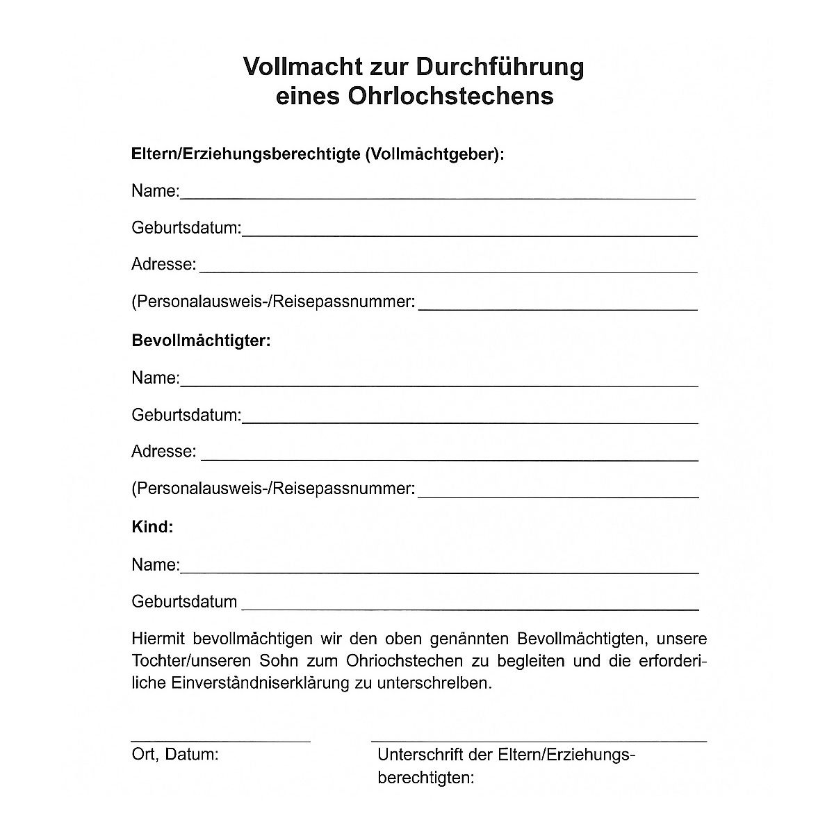 eine klare Formulierung, dass die Person das Kind zum Ohrlochstechen begleiten darf